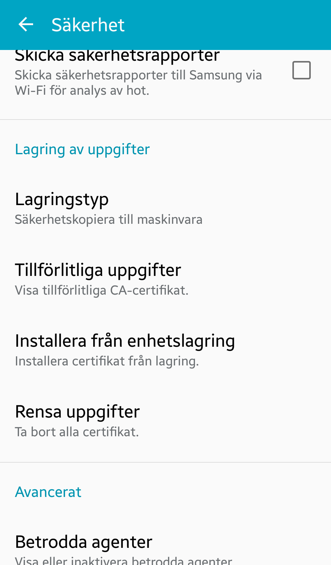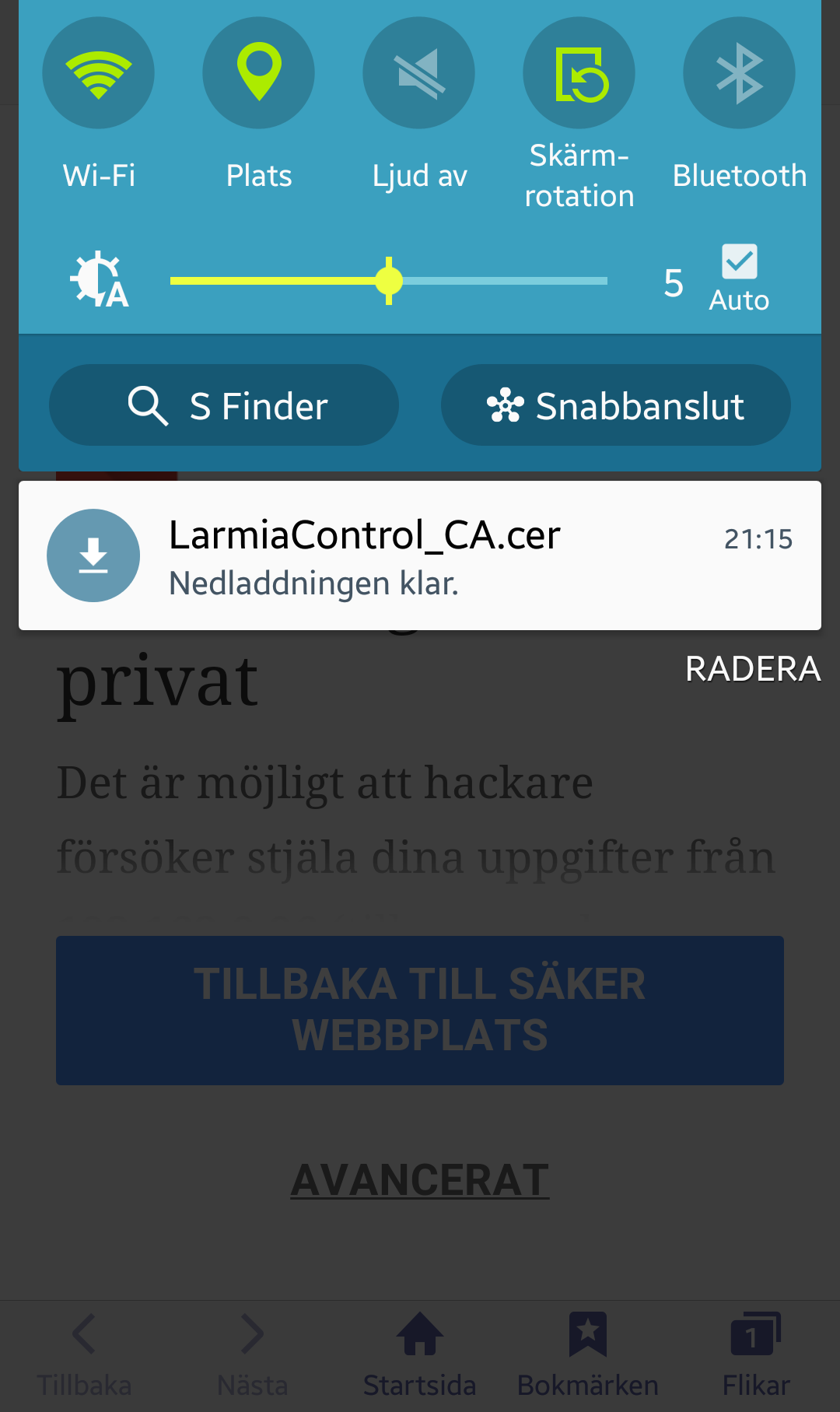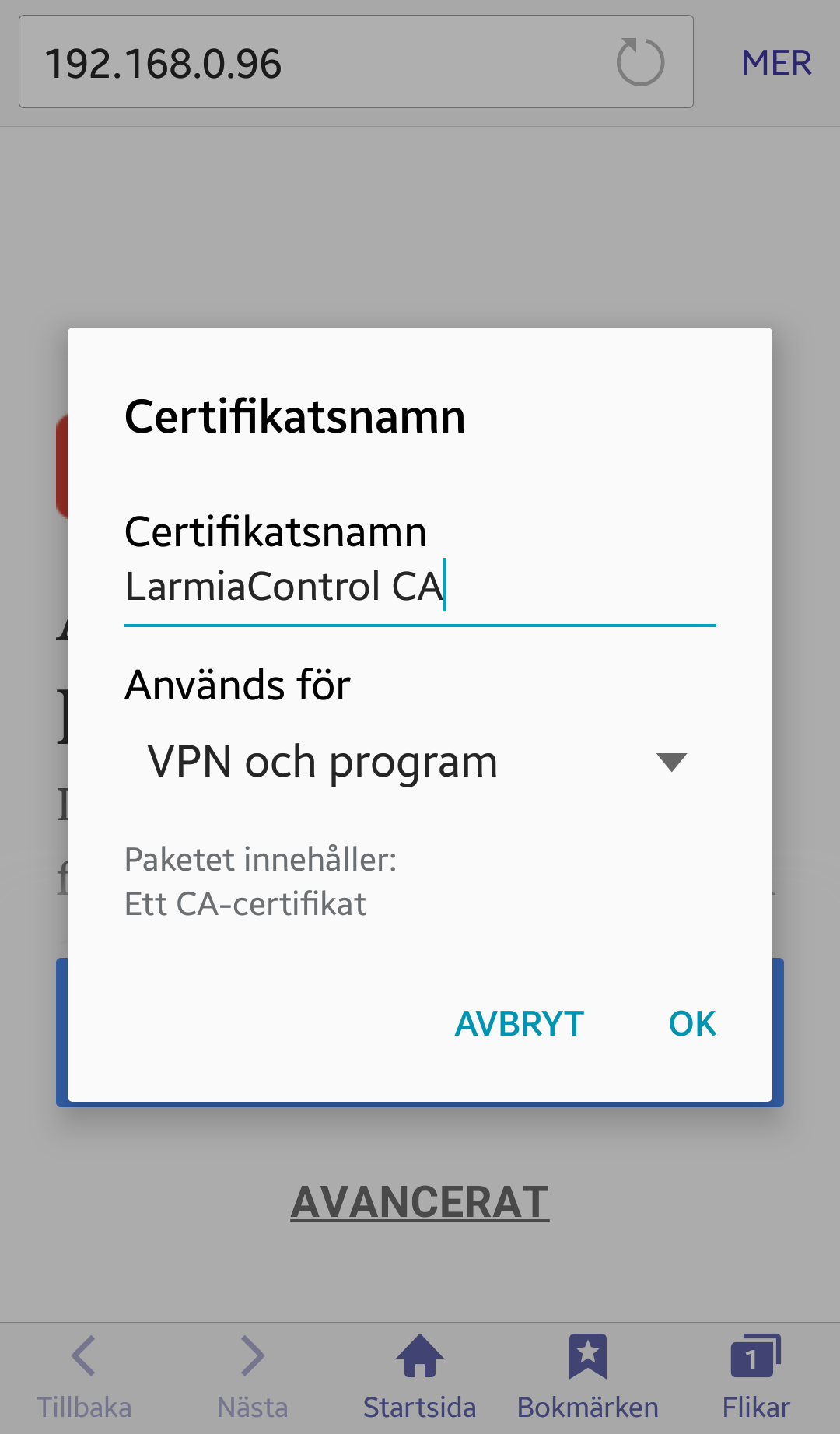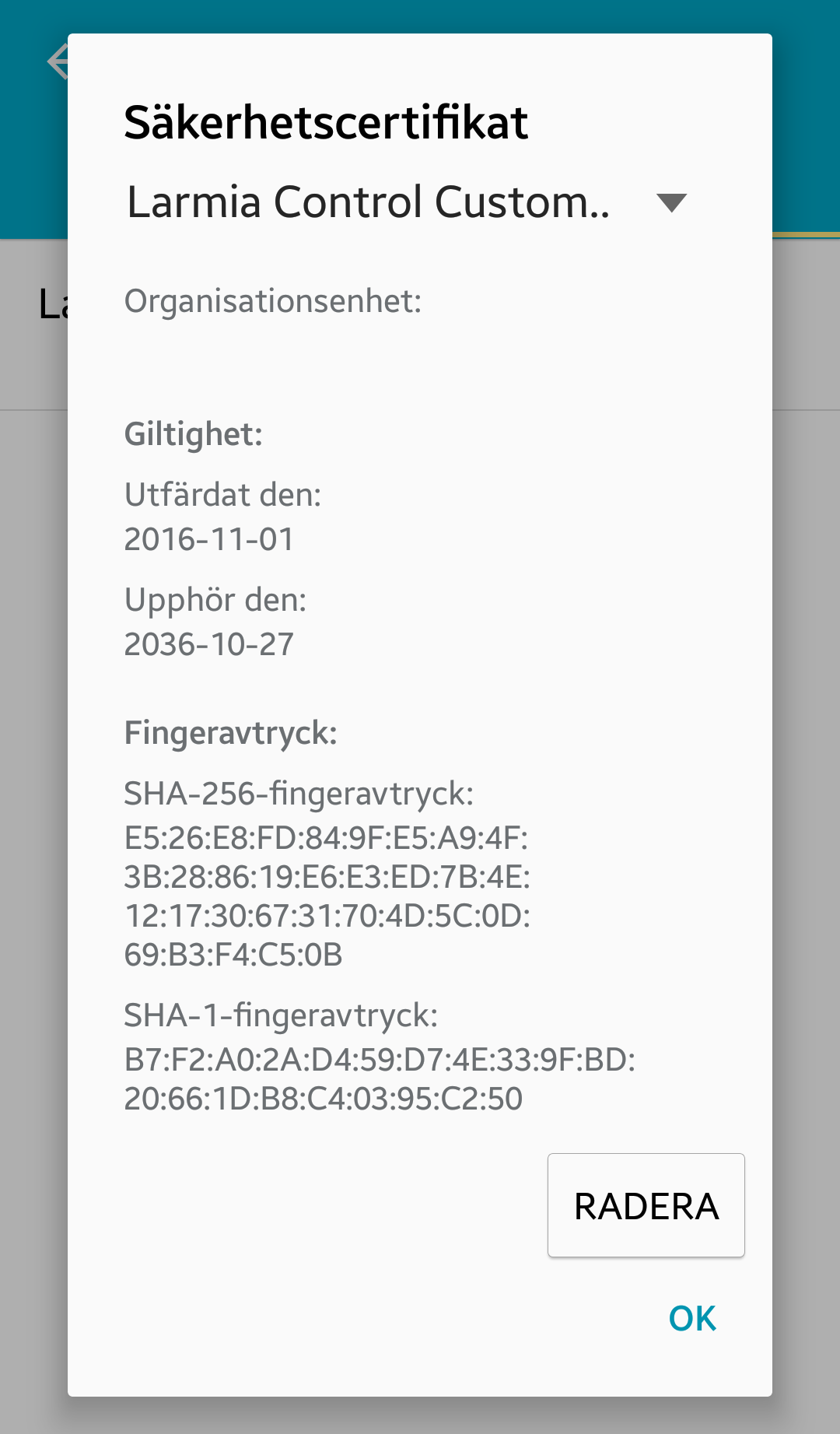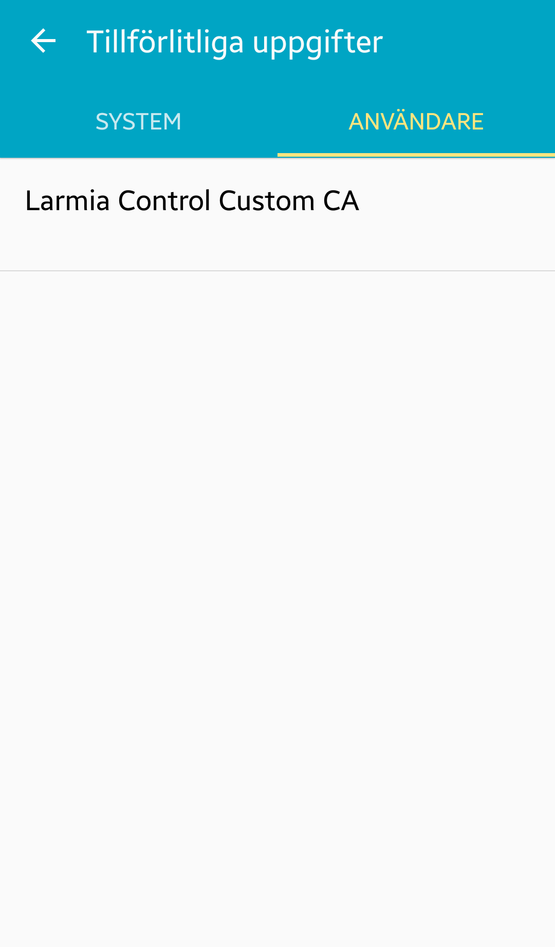 Om du av någon anledning vill radera certifikatet hittas det under Inställningar/Säkerhet/Tillförlitliga uppgifter/Användare/Larmia Control Custom CA.