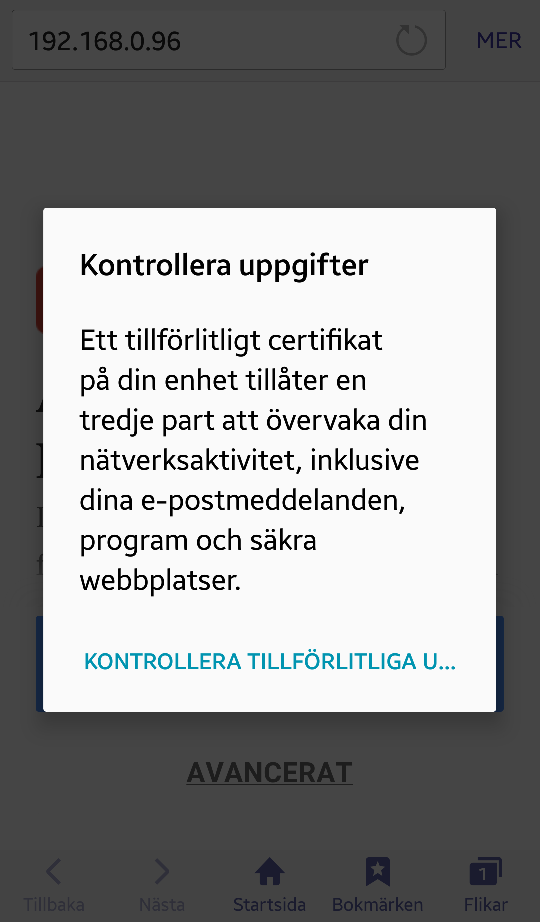 En eller flera varningstexter visas som beskriver att certifikatets autenticitet inte kan bekräftas.