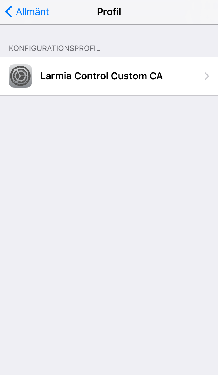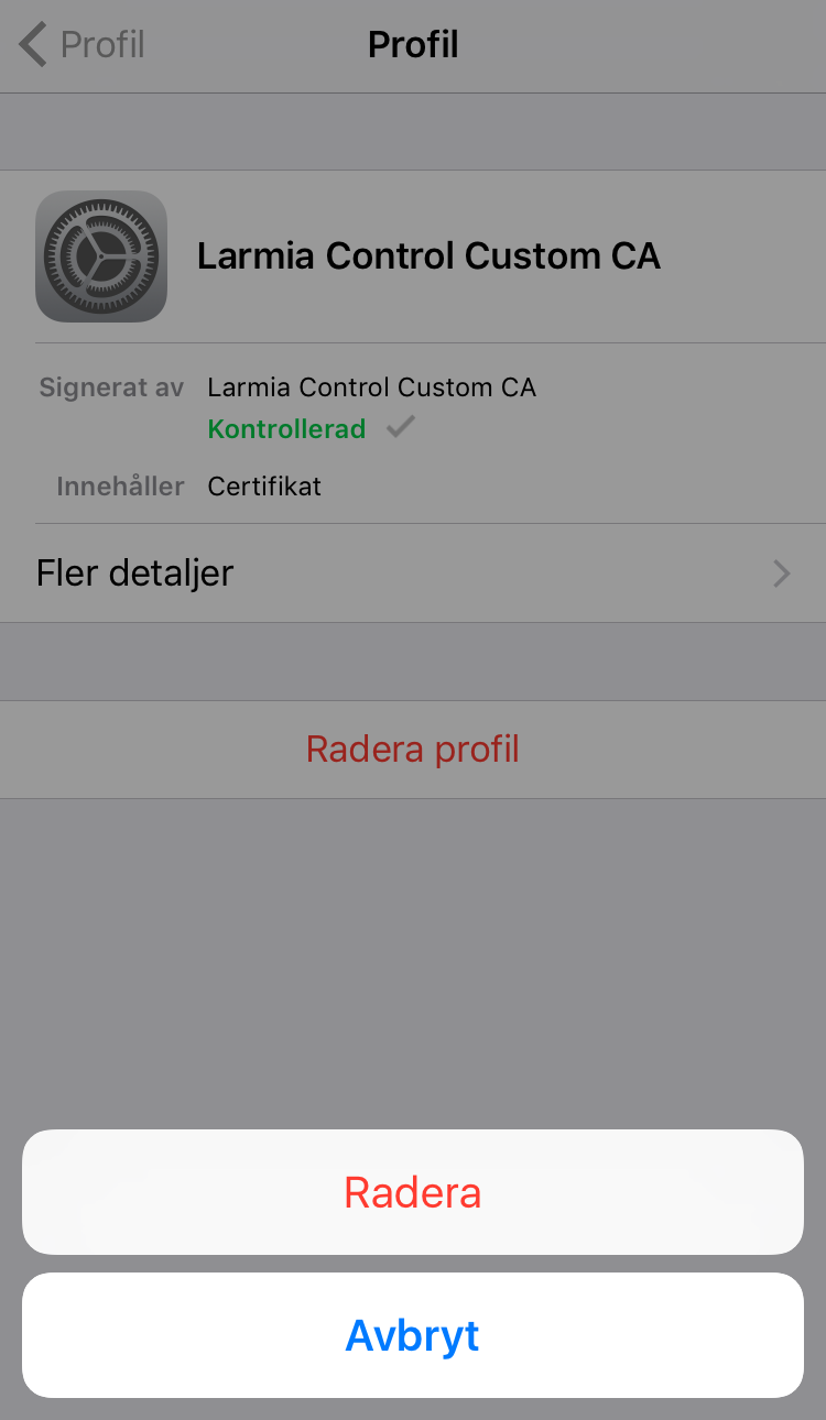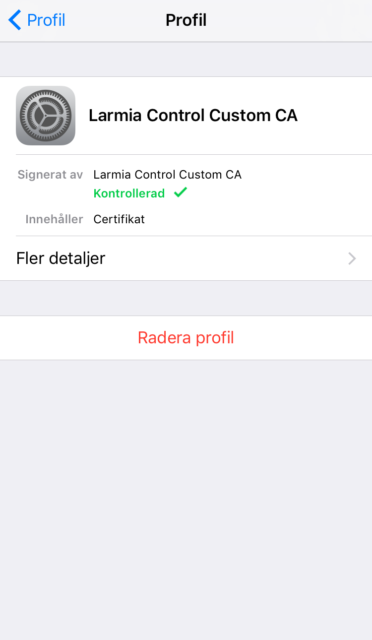 Om du av någon anledning vill radera certifikatet hittas det under Inställningar/Allmänt/Profil/Larmia Control Custom CA.