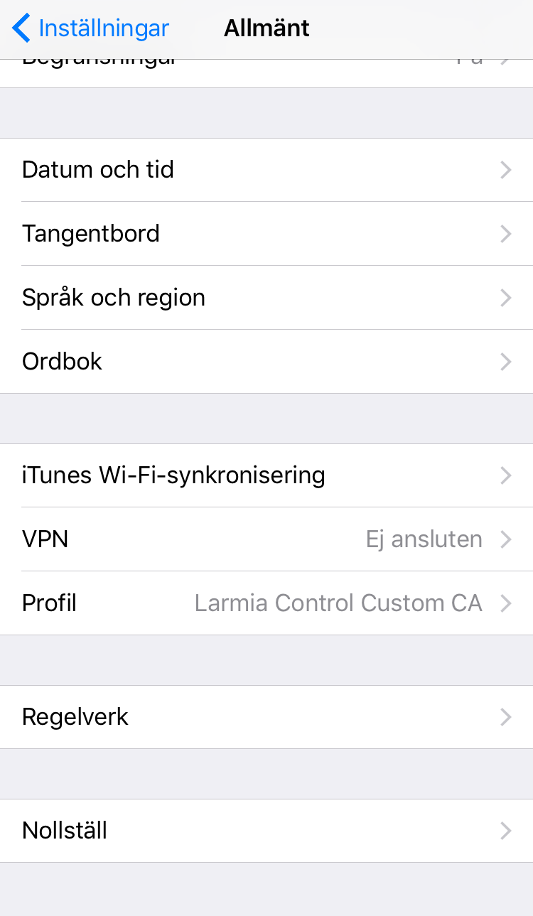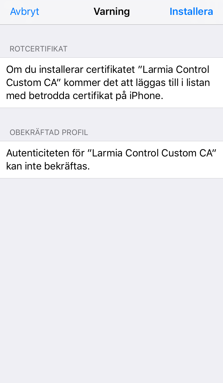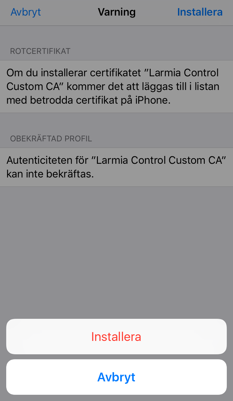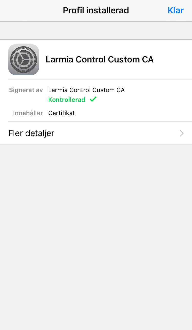Om du av någon anledning vill radera certifikatet hittas det under Inställningar/Allmänt/Profil/Larmia Control Custom CA.