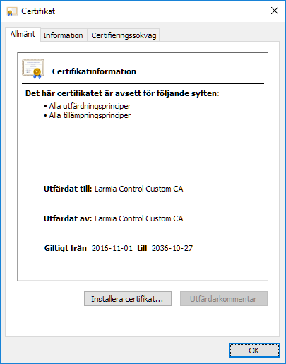 Genom att ladda ner och installera Larmia Control AB's rotcertifikat slipper du eventuella varningar som kan visas i webbläsaren eftersom de individuella enhets-certifikaten inte är signerade av en betrodd tredje part.