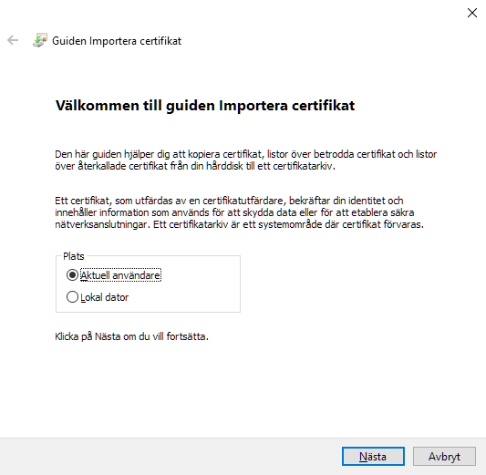 Du ges möjlighet att välja om certifikatet ska installeras enbart för den aktuella (inloggade) användaren eller för alla konton på den lokala datorn.