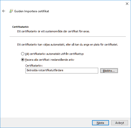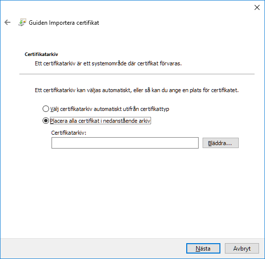 Markera Placera alla certifikat i nedanstående arkiv och klicka Bläddra.