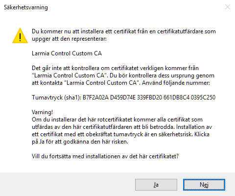 Leta upp den nedladdade filen (LarmiaControl_CA.cer) och dubbelklicka på den för att påbörja installationen