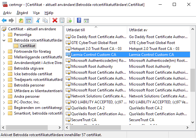 Bläddra fram Betrodda rotcertifikatutfärdare/Certifikat. Högerklicka på Larmia Control Custom CA, välj Ta bort och bekräfta med Ja i de nästföljande dialogerna.